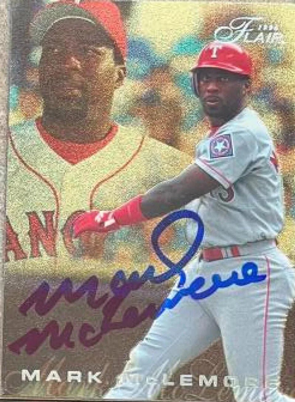 Carte de baseball Flair 1996 signée par Mark McLemore - Texas Rangers (Fond doré, lettrage argenté)