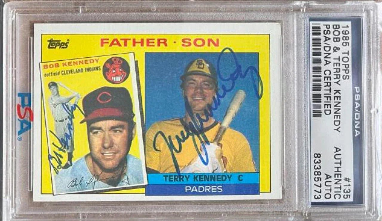 ボブとテリー・ケネディの直筆サイン入り 1985 年 父と息子のトップス ベースボール カード - PSA/DNA 認証